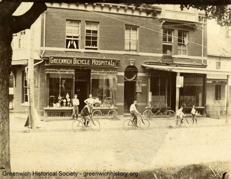 Bicyclists and bystanders in front of the Greenwich Bicycle Hospital (located in the Israel L. Mead Building) at the southwest corner of West Greenwich Avenue and West Putnam Avenue in Greenwich, Connecticut.Collection