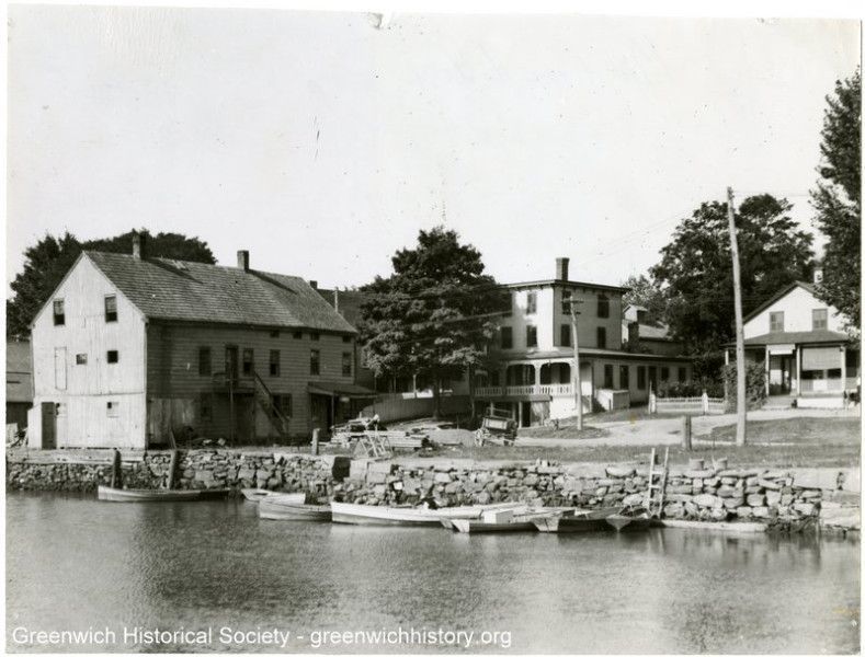 A view of the Cos Cob waterfront showing a warehouse (at left in the foreground). Near the center of the image in the background is the building that housed Toby's Tavern. At right is the Justus Luke Bush Storehouse, constructed in 1805.Collection