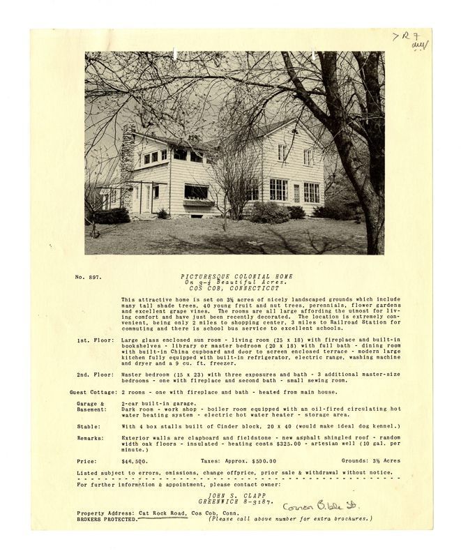 Ad with an image of the house and information about its location, grounds, rooms, and price.