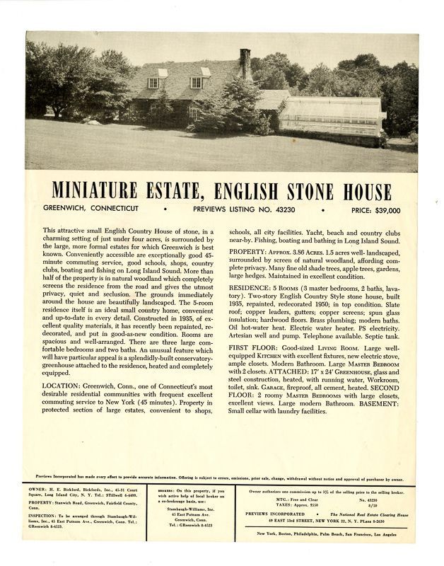 Ad with an image of the house with its connected greenhouse. Ad also includes information on its location, grounds, rooms, and price.Collection