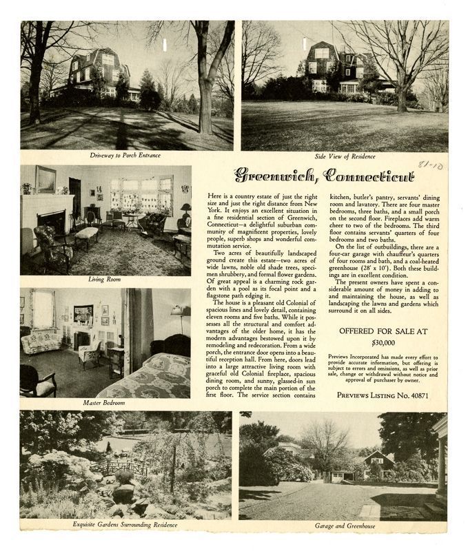 Ad with images of the house, its interiors, lawns, and outbuildings. Ad also includes information on the house's location, grounds, rooms, and price.Collection