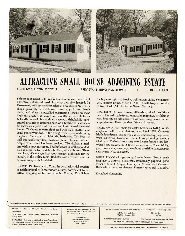 Ad with two images of the house and information on its location, grounds, rooms, and price.