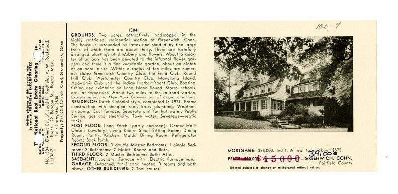 Ad with an image of the house and information on its location, rooms, grounds, and price.