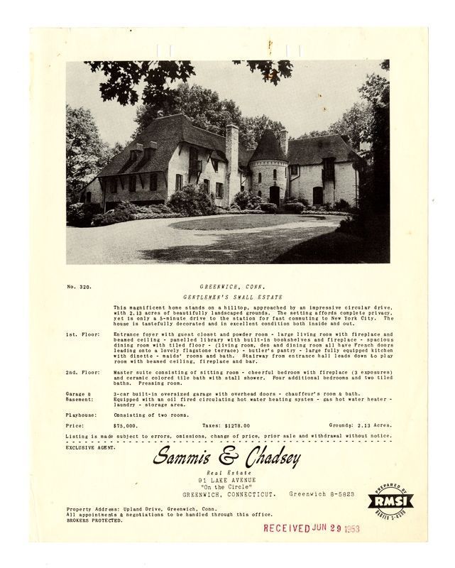 Ad with an image of the house and information on its location, grounds, rooms, and price.
