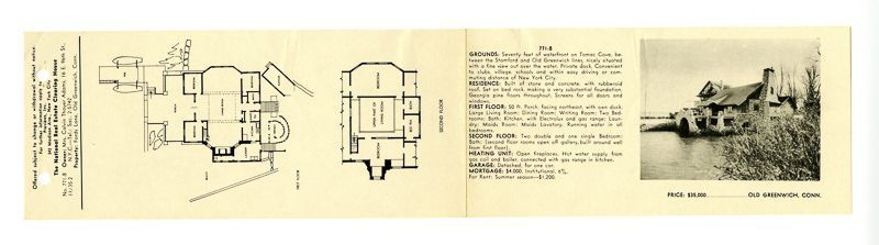 Ad with floorplans of the house as well as a view of the house and the Sound around it. Ad also includes information on the house's location, grounds, rooms, and price.Collection