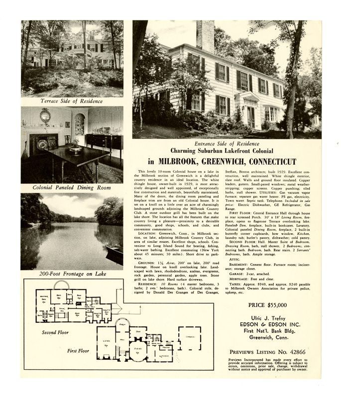 Ad with images of the house, its interiors, floor plans, and neighboring lake. Ad also includes information on the house's location, grounds, rooms, and price.Collection