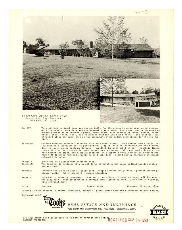 Ad with images of the house and its lawn. Ad also includes information on the house's grounds, rooms, outbuildings, and price.Collection