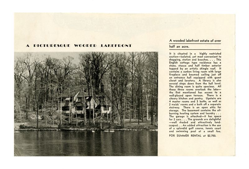Ad with an image of the house as viewed from the neighboring lake. Ad also includes information on the house's architecture, rooms, and rental price.Collection