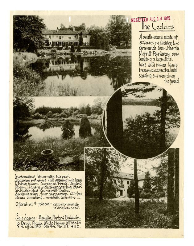 Ad with images of the house and its grounds. Ad also includes information on the estate's location, grounds, architecture, and price.Collection