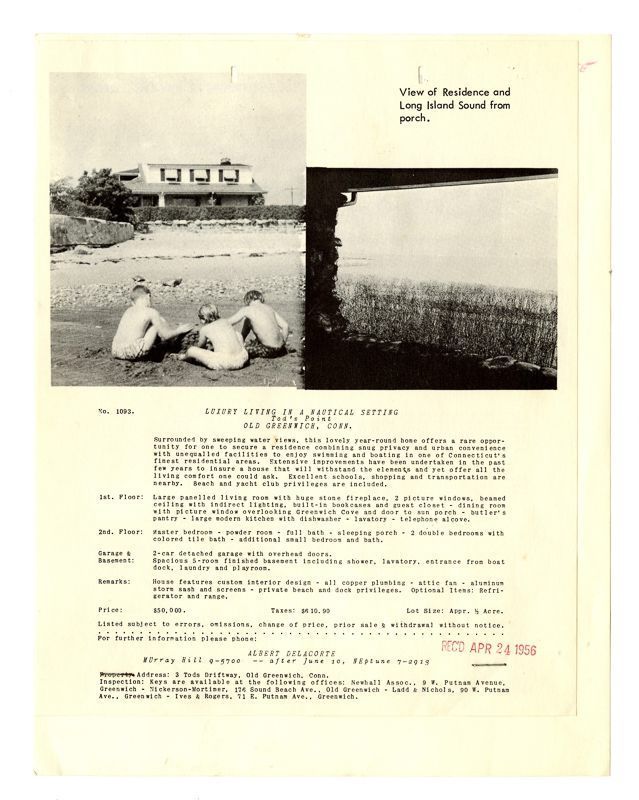 Ad with an image of three boys on the beach in front of the house and a view of the Sound from the house. The ad also includes information on the house's location, rooms, and price.Collection