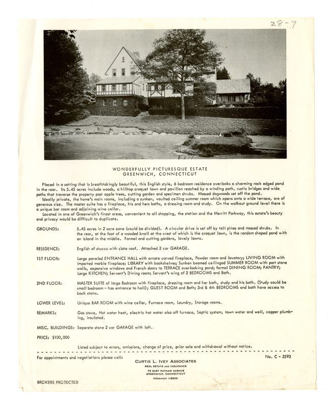 Ad with an image of the house and information on its architecture, rooms, grounds, and price.