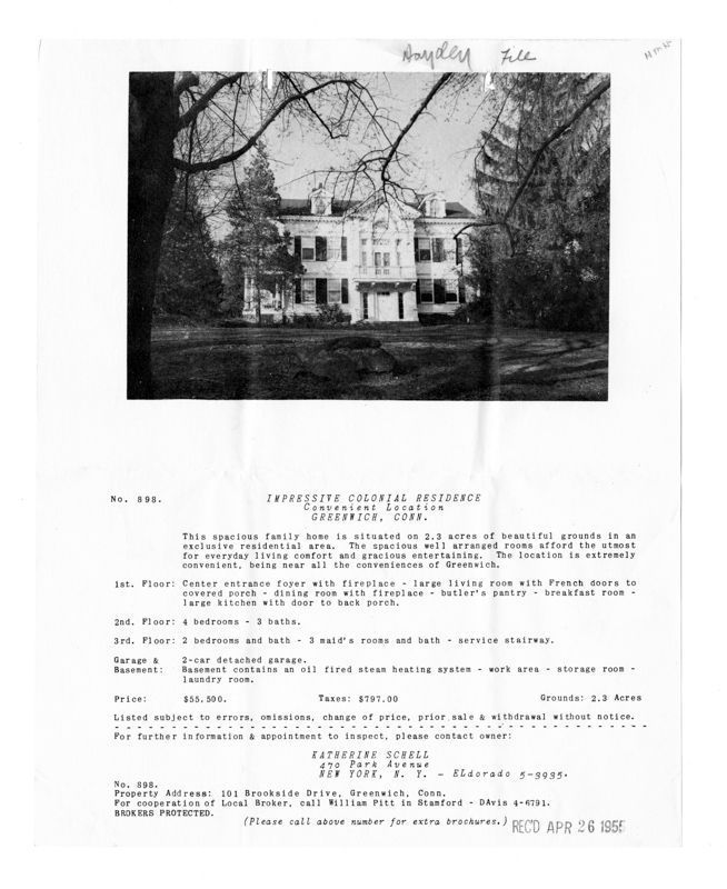 Ad showing a view of the front of the house with information about the buildings, grounds, surrounding area, and price.Collection
