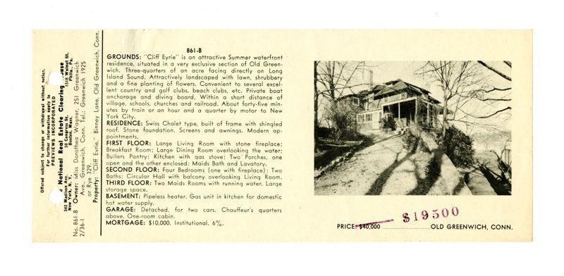 Ad showing the front of the house from the driveway with information about the buildings, grounds, and price.