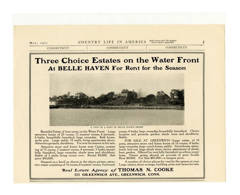 View of houses on the Belle Haven shore from the water with information about the buildings.