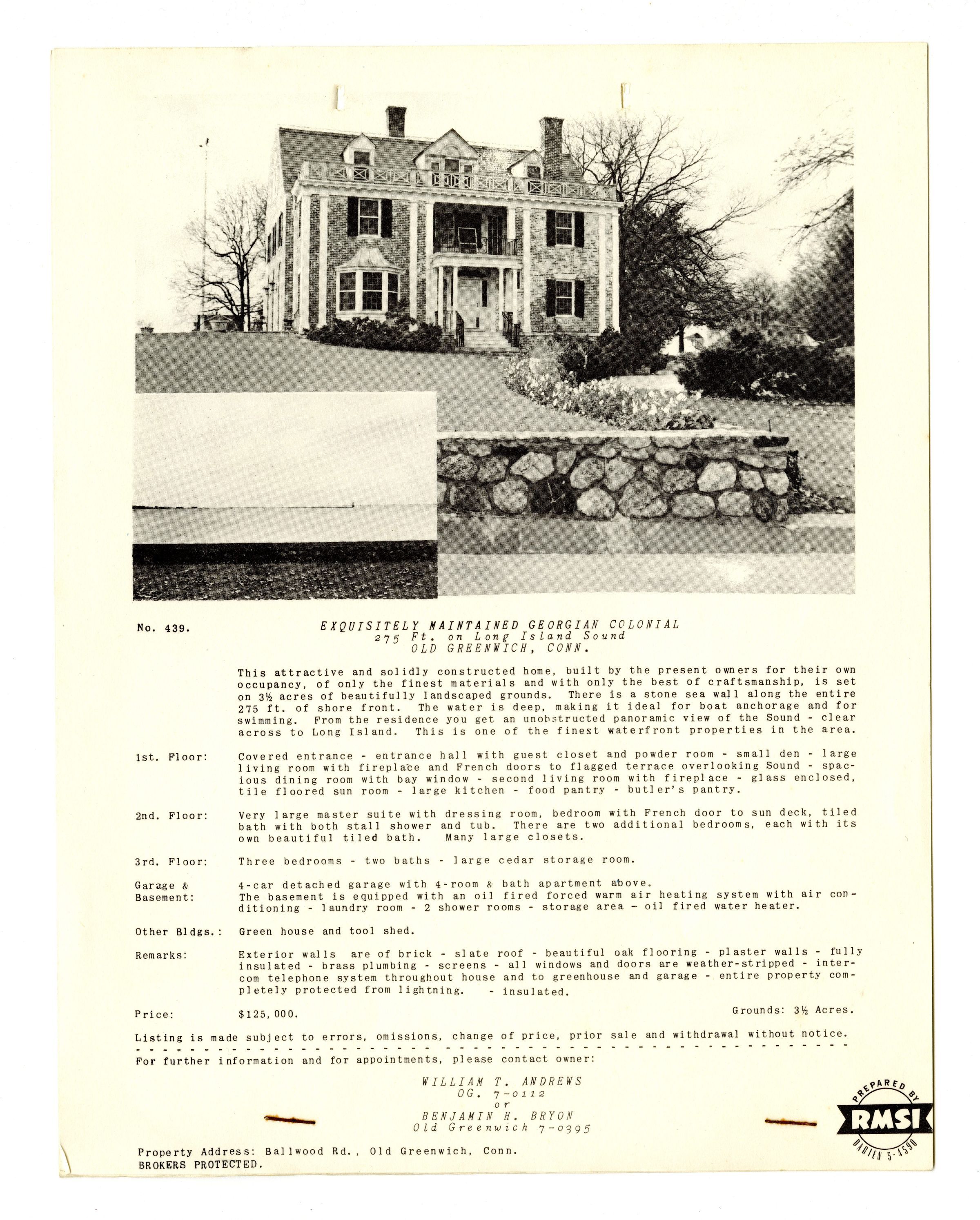 Ad showing a front view of the house and the view of the Long Island Sound from the house, and additional information about the building and grounds.Collection
