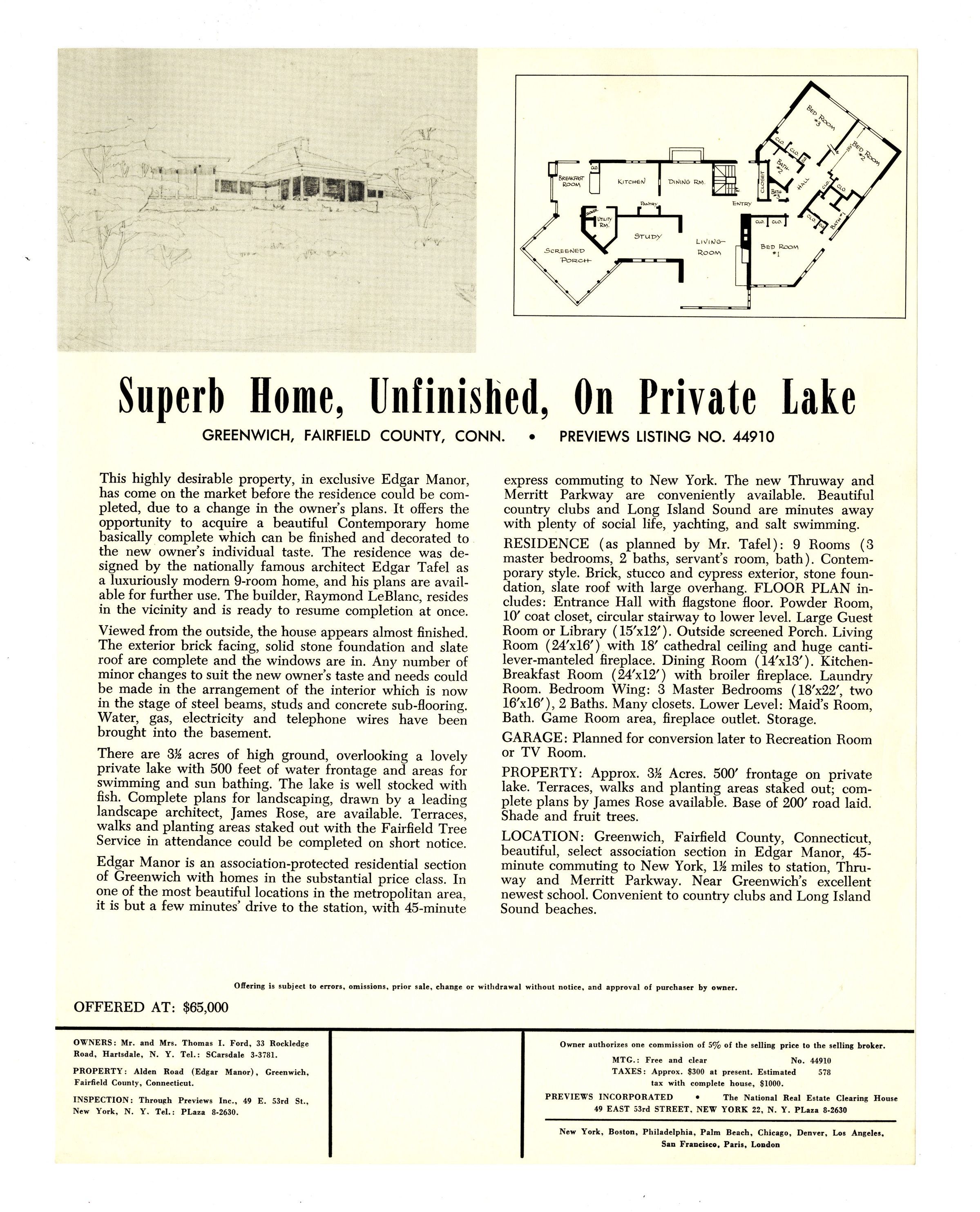 Ad describing an unfinished home on a lake, believed to be the first version of what would become the Ramanos residence.Collection