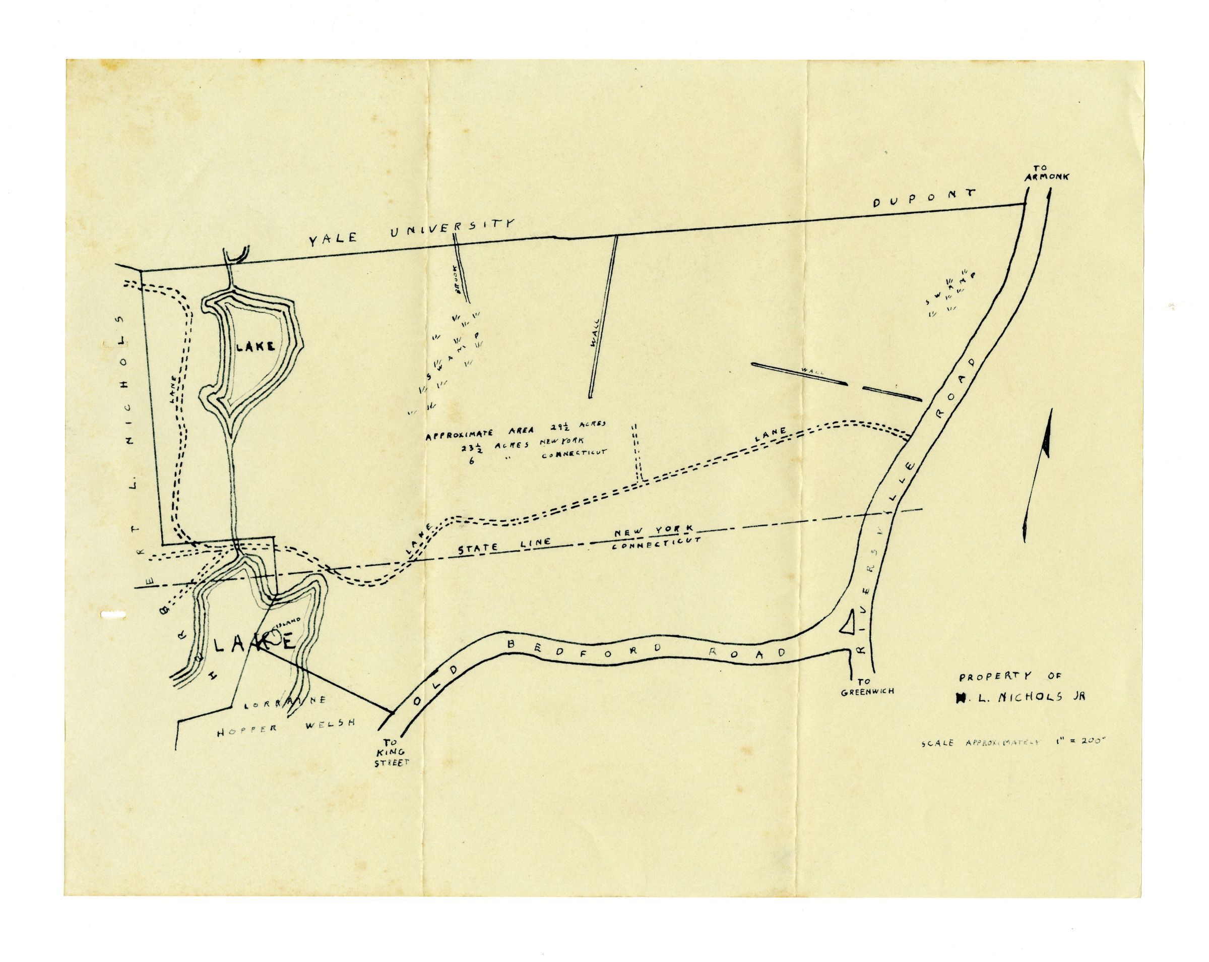 Map showing the position of the Nichols property with lake and roads.