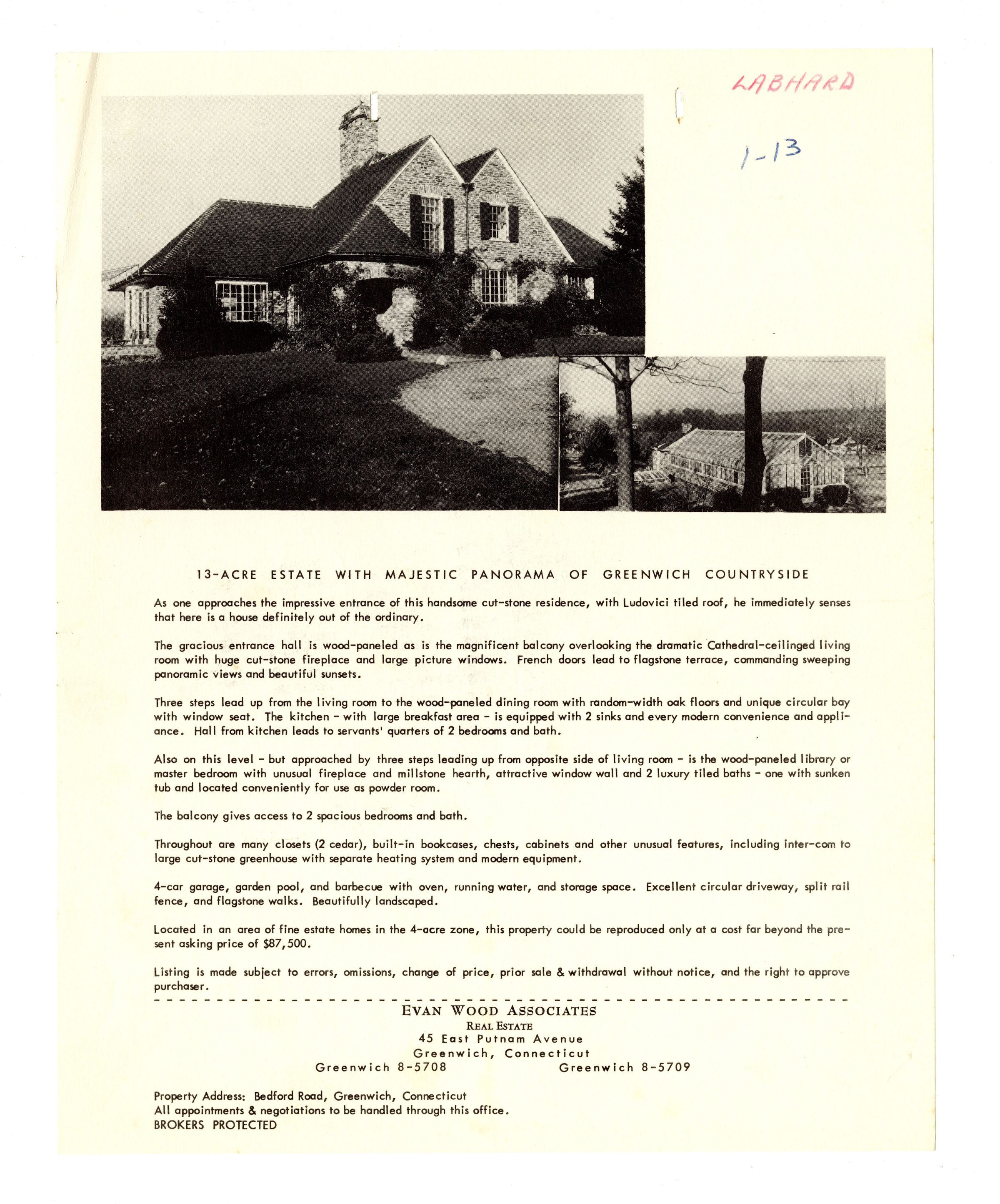 Ad showing the stone house and greenhouse, with information about the house, grounds, and price.