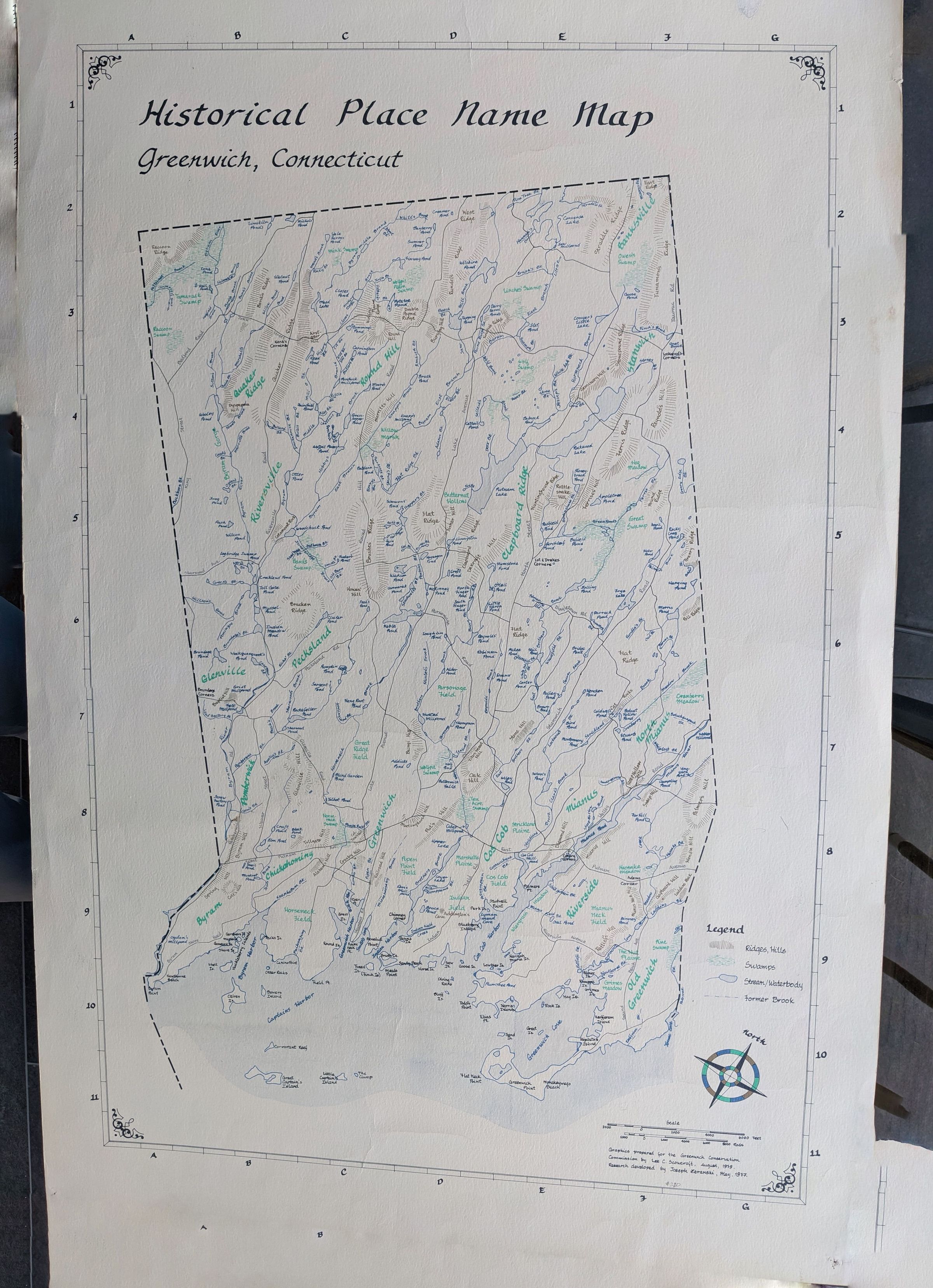 Graphics prepared for the Greenwich Conservation Commission by Lee C. Scowcroft, August, 1979. Research developed by Joseph Zeranski, May, 1977. Research, Compilation and Description by Joseph Zeranski; Graphics by Lee C. Scowcroft; Drawings by Sheila J. McMahon; Coordination by Michael A. Aurelia; Funded by the Conservation Commission and the Inland Wetlands and Watercourses Agency; Special thanks to all those knowledgeable citizens who helped make this map possible. June 1980