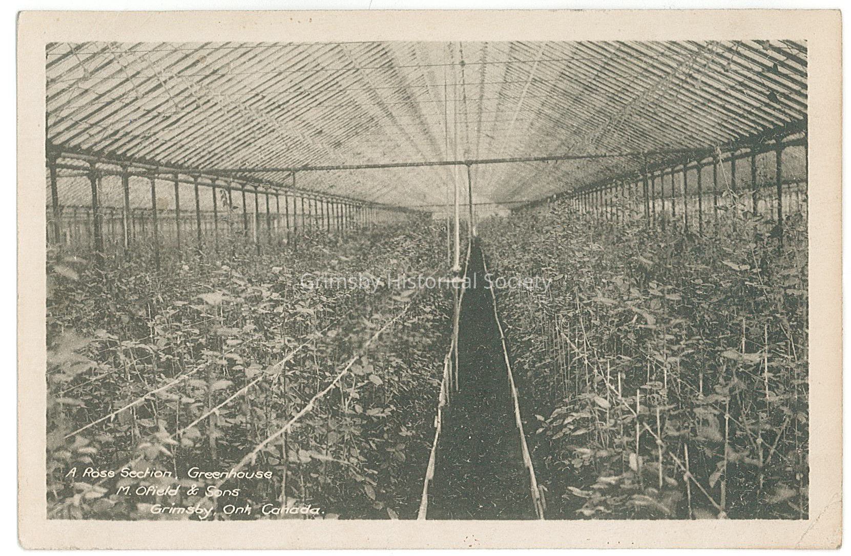 The Ofield family came to Grimsby in 1890, when Matthias (Tice) Ofield settled in what is now Casablanca Boulevard. He bought a farm on the lakeshore and went into market gardening, taking produce to the Hamilton Market. His eldest son, Landy, built a greenhouse. By 1914, they had four acres of greenhouses. Later, they switched to growing roses and became one of the largest wholesale florists in Canada. El Rancho Casablanca would later be built over the site of the Ofield greenhouses.