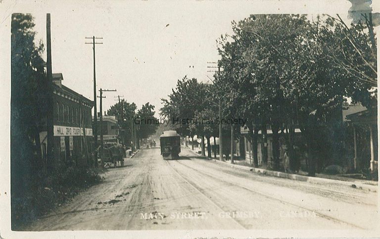 Looking west on Main Street. On the left hand side is the Hall Zryd Foundry Company (1909-1913). The hay wagon on the left hand side located at the corner of Oak Street. The HG&B streetcar running down the middle of an unpaved Main Street that appears to have newly installed cement curbs in place along the north side of the roadway.