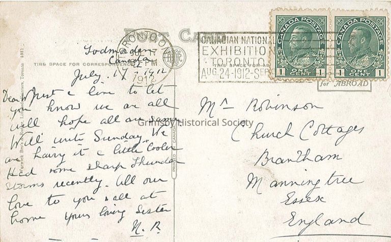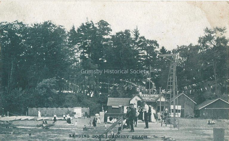Grimsby Beach pier looking inland towards Victoria Terrace from the outer pier. At the inner end of the pier is the Welcome sign above the ticket booth.
