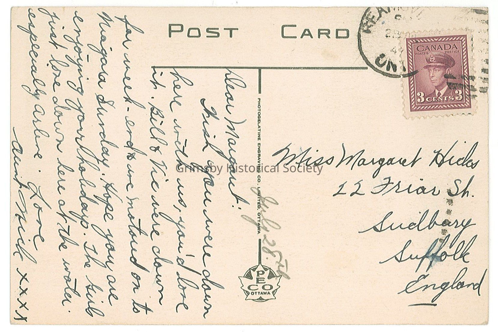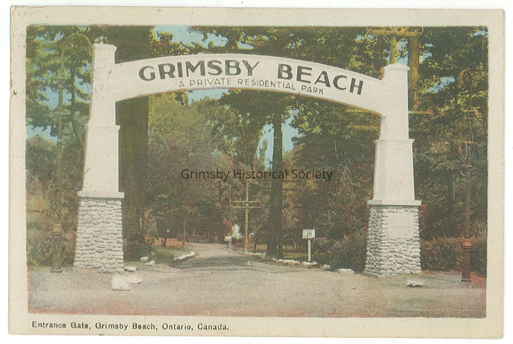 The lower pillars were made of beach stone, with wooden pillars on top. On the righthand stone pillar is a plague which reads, " In commemoration of the Visit to Canada of King George and Queen Elizabeth, 1939". The gates were constructed with funds raised by the Grimsby Beach Cottager's Association.