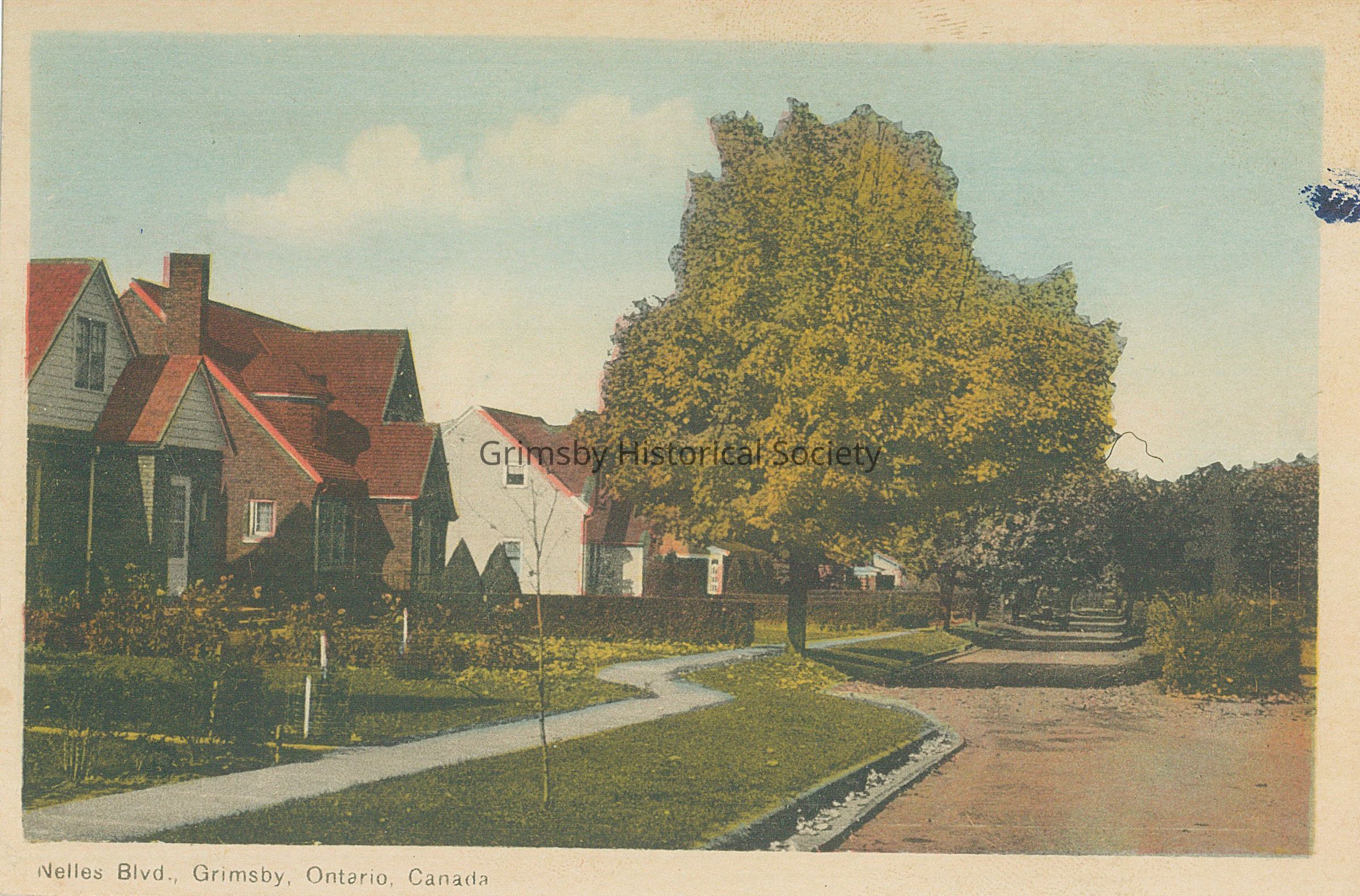 A view of homes on Nelles Blvd including the median down the centre of the street. Nelles Blvd is a sub division created by Maria Nelles Rutherford on the former Nelles Manor farm. The homes were built by Shafer Brothers - construction started in the 1920s.Context