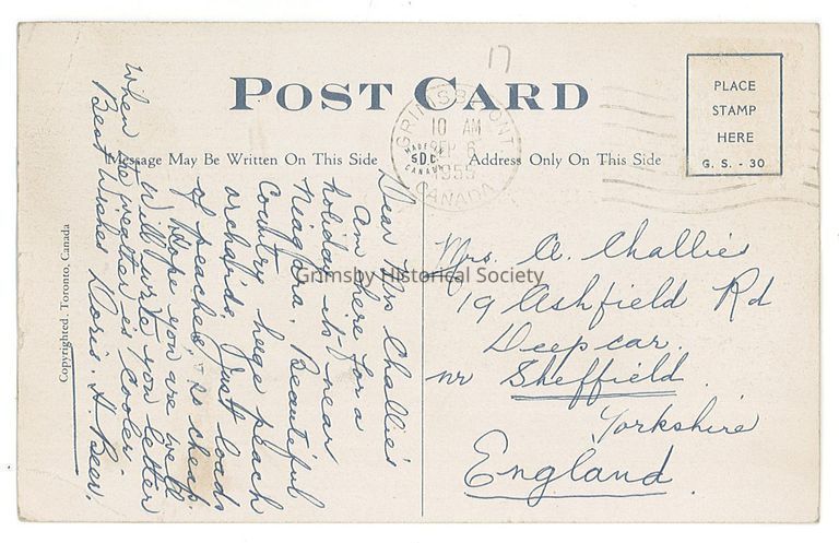 "Greetings from GRIMSBY, Ontario, Canada."
