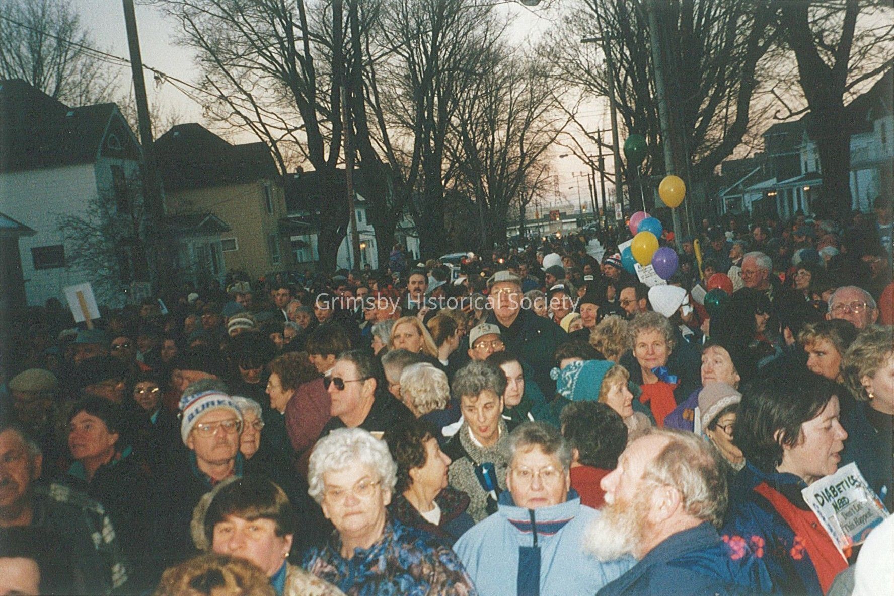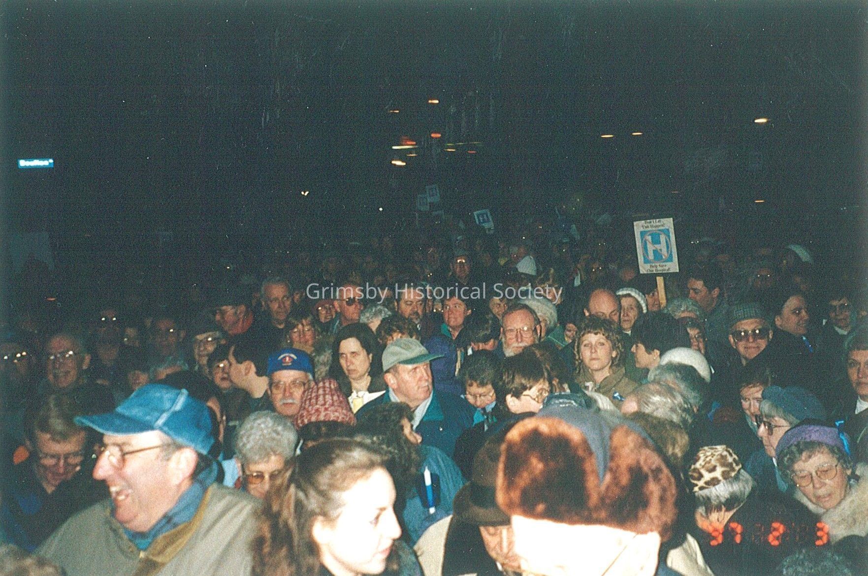 Two photos of candlelight parade for the hospital - taken from the high school steps looking onto Kidd Avenue, February 3, 1997 - some 6,000 people attended the rally at Grimsby Secondary School grounds.Other Names and Numbers