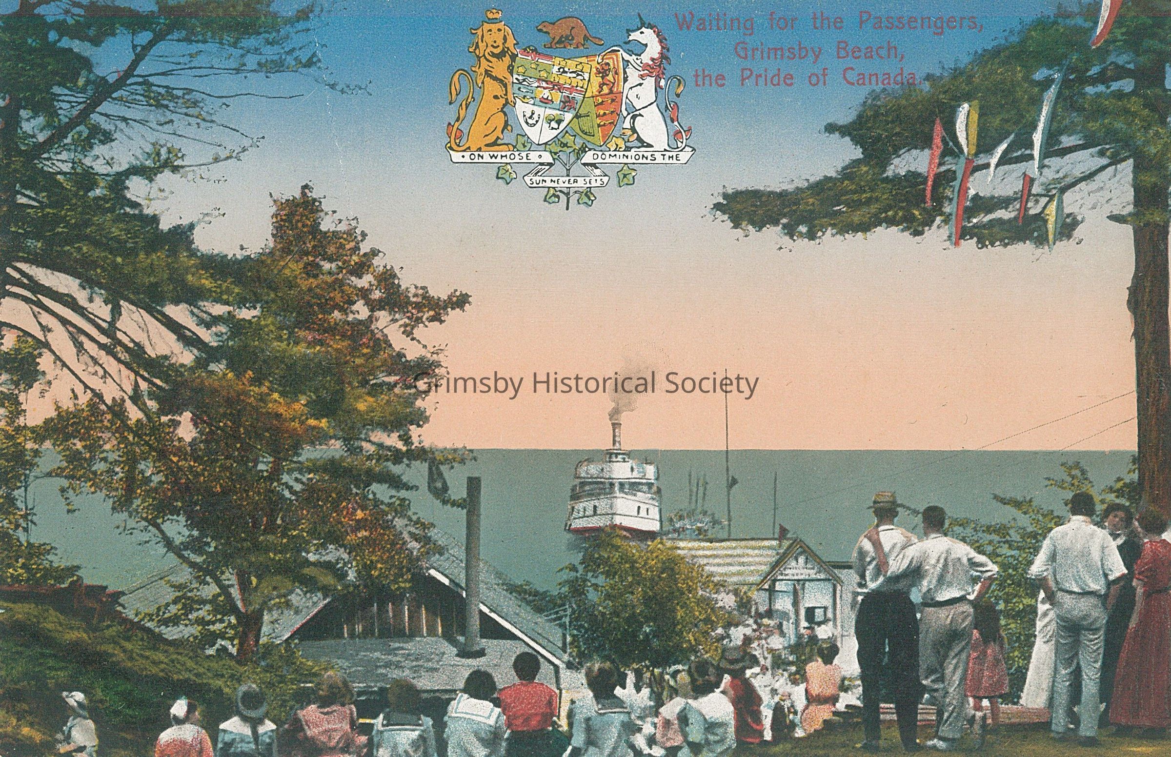 Handcoloured photo of groups of people waiting for the steamer to disembark at the Grimsby Beach Pier.