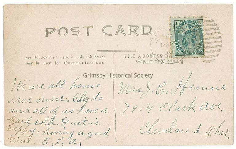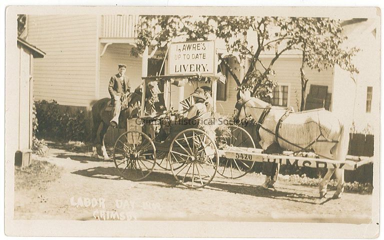 James Murray Lawrie, liveryman, operated his business between 1900 & 1920 at 7 and 9 Main St West. The white frame cottage in the background was William Gillmore's cottage which was at this location in this era, later purchased by JM Lawrie and wife Elma May.Dimensions