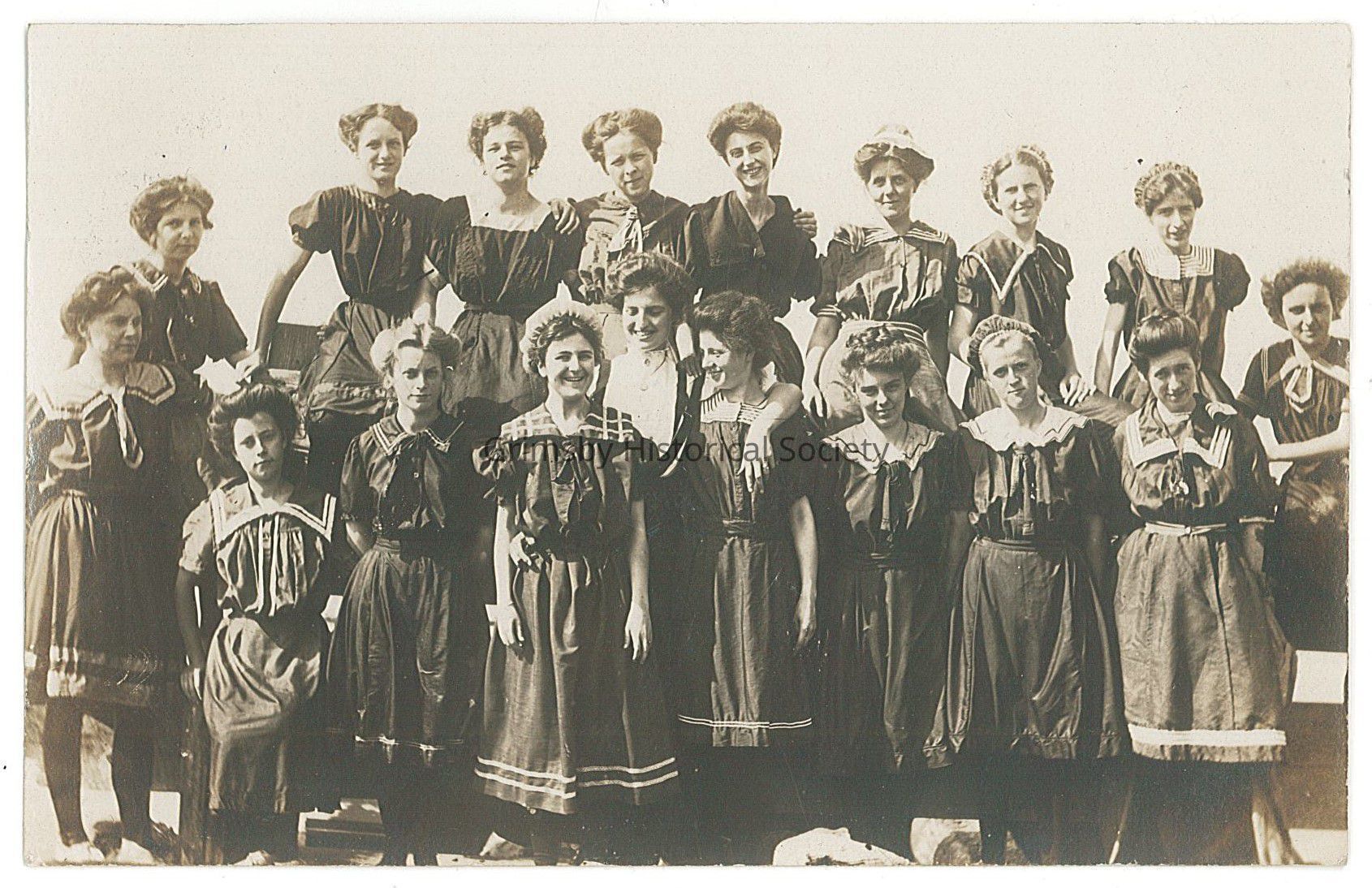 Pre 1910 group photo of Grimsby women in their swimsuits. Photo location unknown; image background appears doctored.