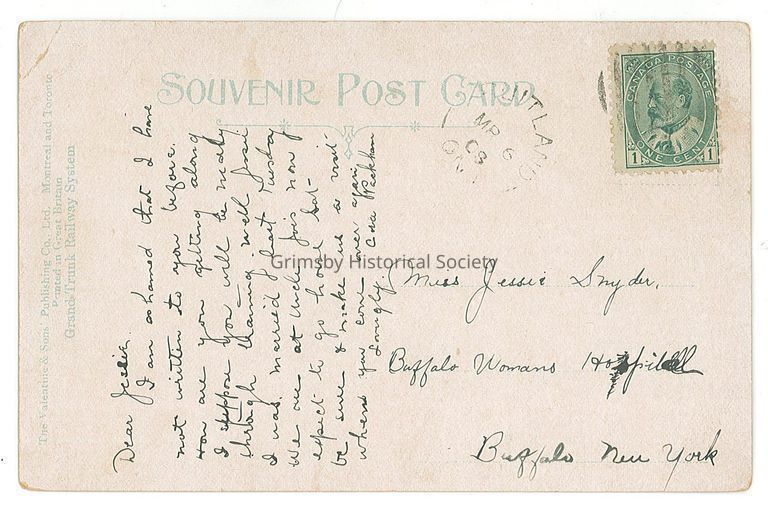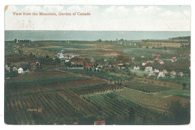 Moving right along Main St East, south side, the large red roofed house, centre prior to Robinson Street is the Fanny Gibson residence & barn and to the right Rev. D.V. Lucas residence. Robinson St North and South are visible but only getting built up. The BR Nelles Canning factory and smoke stack on Robinson north before the tracks are the largest cluster of buildings.