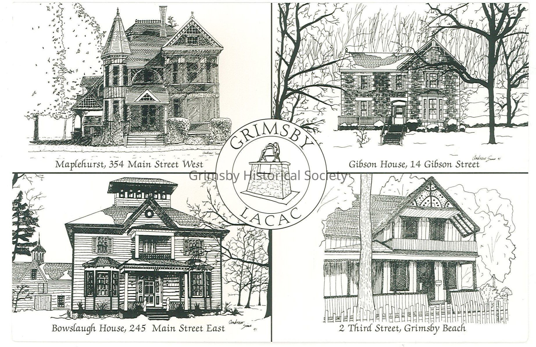 Houses shown are Maplehurst (354 Main St W), Gibson House ( 14 Gibson St), Bowslaugh House ( 245 Main St E) and 2 Third Street (Grimsby Beach).