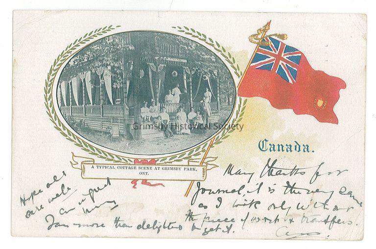 Patriotic postcard of a group at a Grimsby Park cottage, postmarked 1911