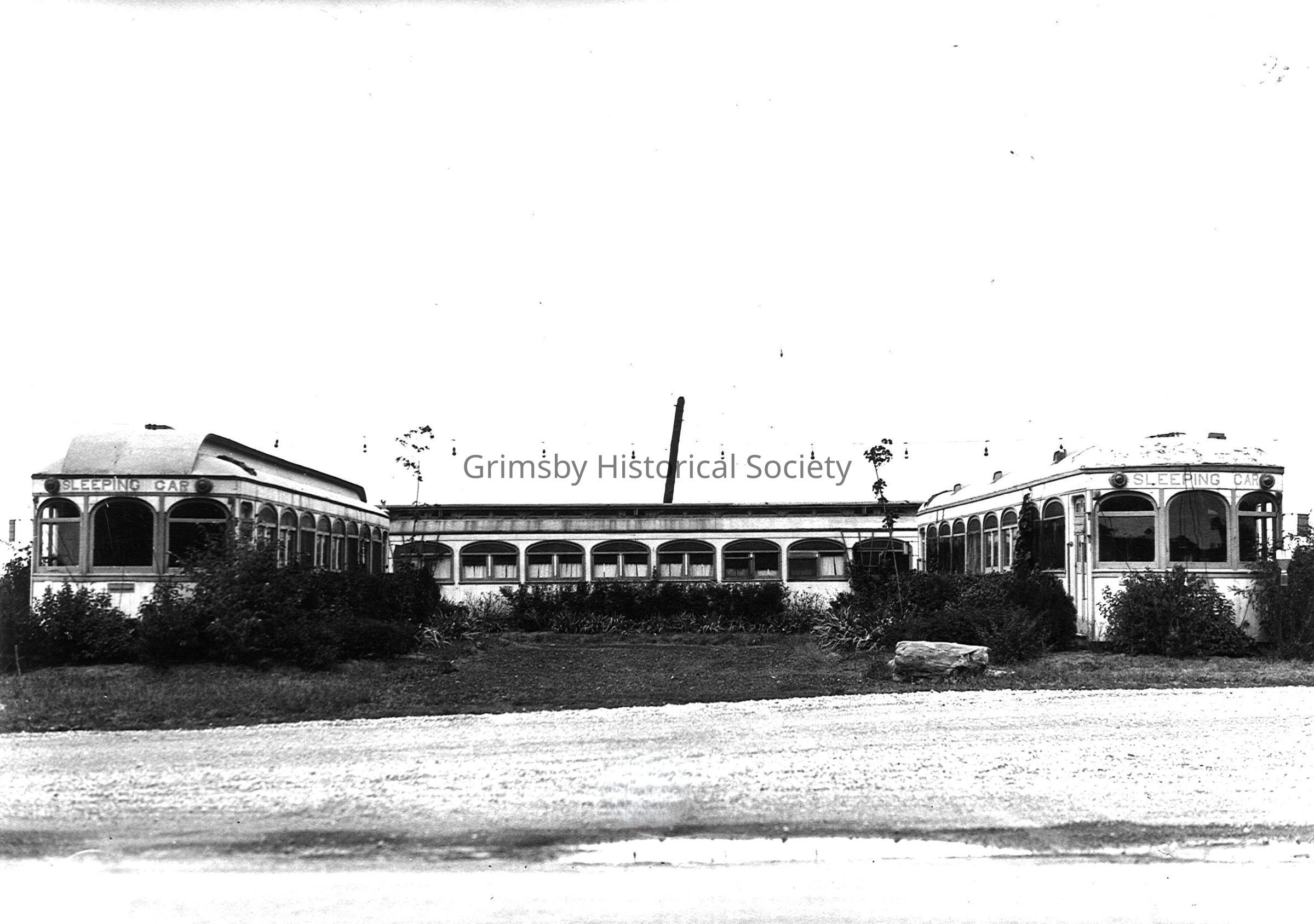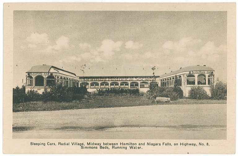 The Radial Village was constructed by Robert Crawford after the Hamilton, Beamsville and Grimsby railways were dismantled in 1931. He bought seven of the discarded HG&B radial cars, imported two American-made diners from Toronto, and established Radial Village. This unique undertaking was on land owned by Crawford on Main Street East just west of Durham Road where he owned the adjacent brickyard. The Radial Village closed in 1965.