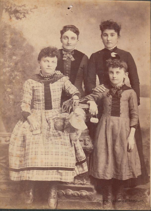 Intergenerational photograph of a family posed for a studio portrait. They wear fashions of the late 19th century including button-front dresses, ribbons at their collars, and high black shoes. The woman on the right, wearing earrings, has a striking expression. The two girls in front rest against a vase, each holding a tiny handbag. It appears as though the older girl is holding all of their bonnets, likely removed for the portrait.
