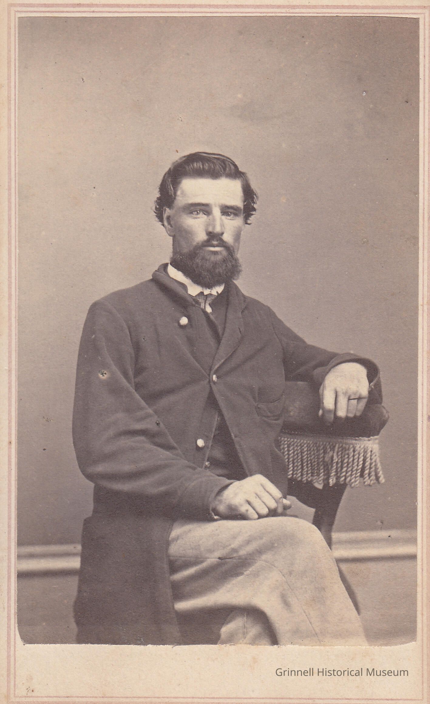 Sitting studio portrait of a young man with a beard and mustache wearing a long dark coat, high white collar, and light-colored trousers. It looks as though he is wearing a wedding band.Photograph Details