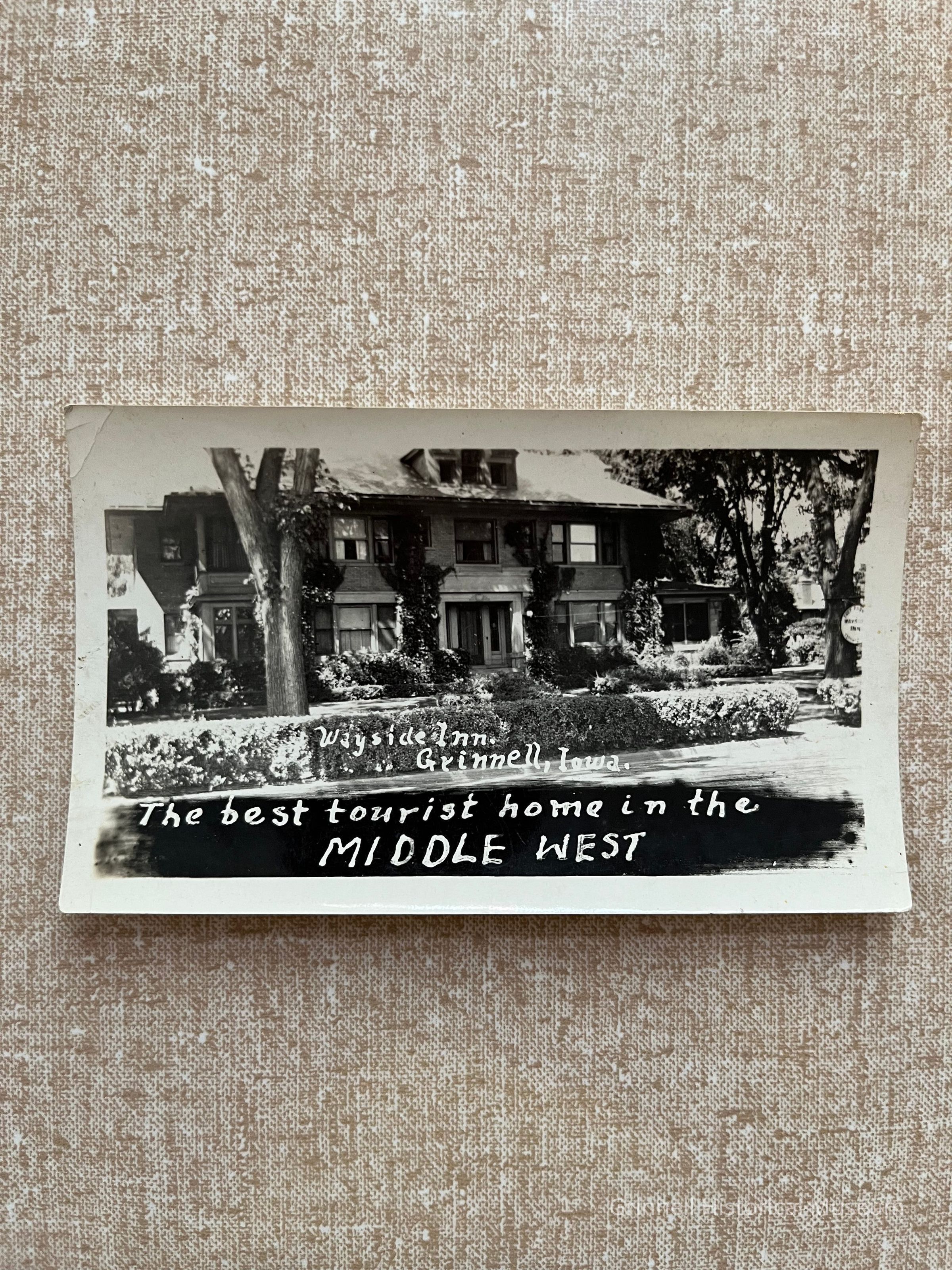 Black and white photograph of the front of Wayside Inn. There is also white writing on the photograph that states "Wayside Inn. Grinnell, Iowa. The best tourist home in the MIDDLE WEST."