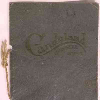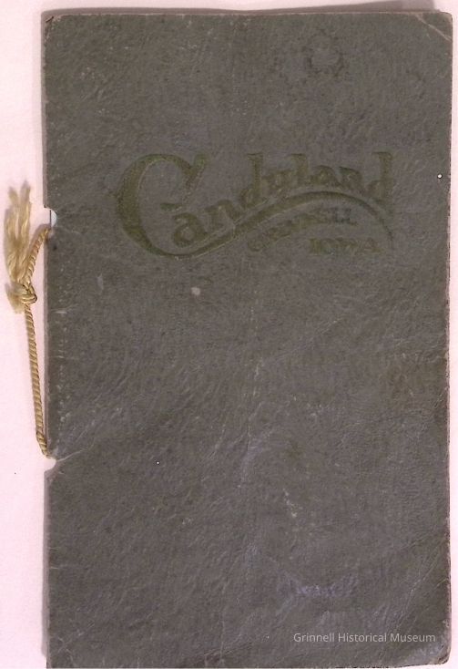 Menu from Candyland, Grinnell, Iowa, with soft green cover. Interior menu printed in black on creme paper. All held together with gold cord.