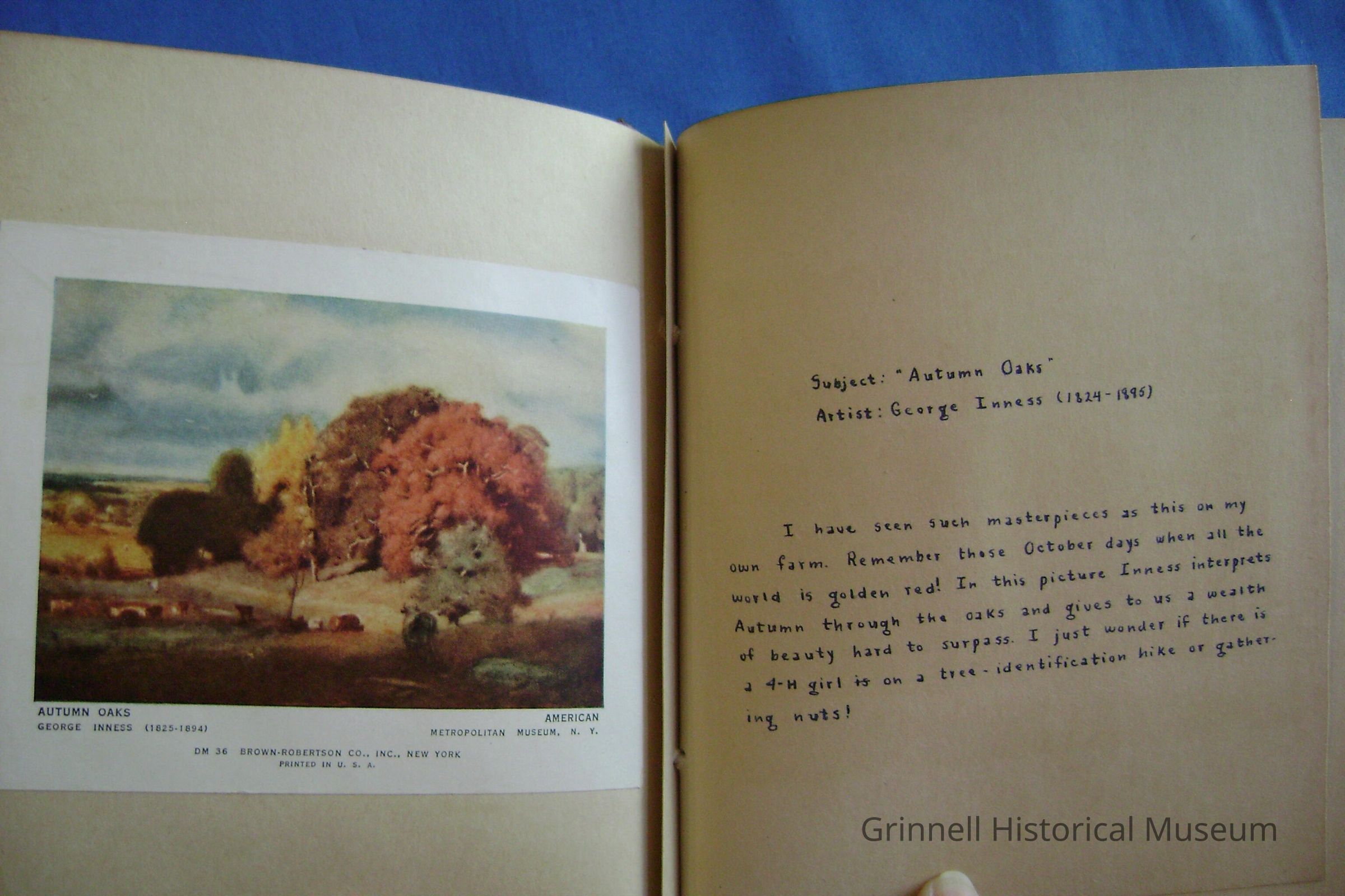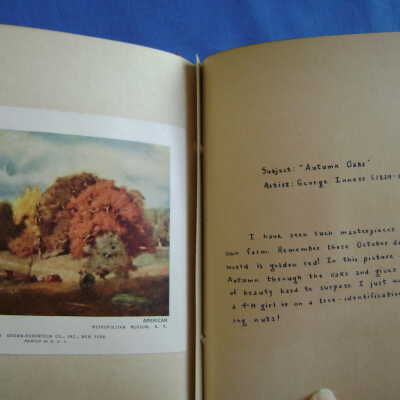 Handmade scrapbook, probably a 4H project. Cloth covered cardboard front and back tied with original cloth tape through 2 grommets. Subject matter is clippings of fine art with handwritten interpretation by the maker of the book. Creator did not sign her work. Cloth covering date from the 30's or 40's, pink cotton with printed design of bows and scotty dogs. Owned by Dorothy Simmons Beason, mother of donor. 6.125"W x 7"H x 1" tall