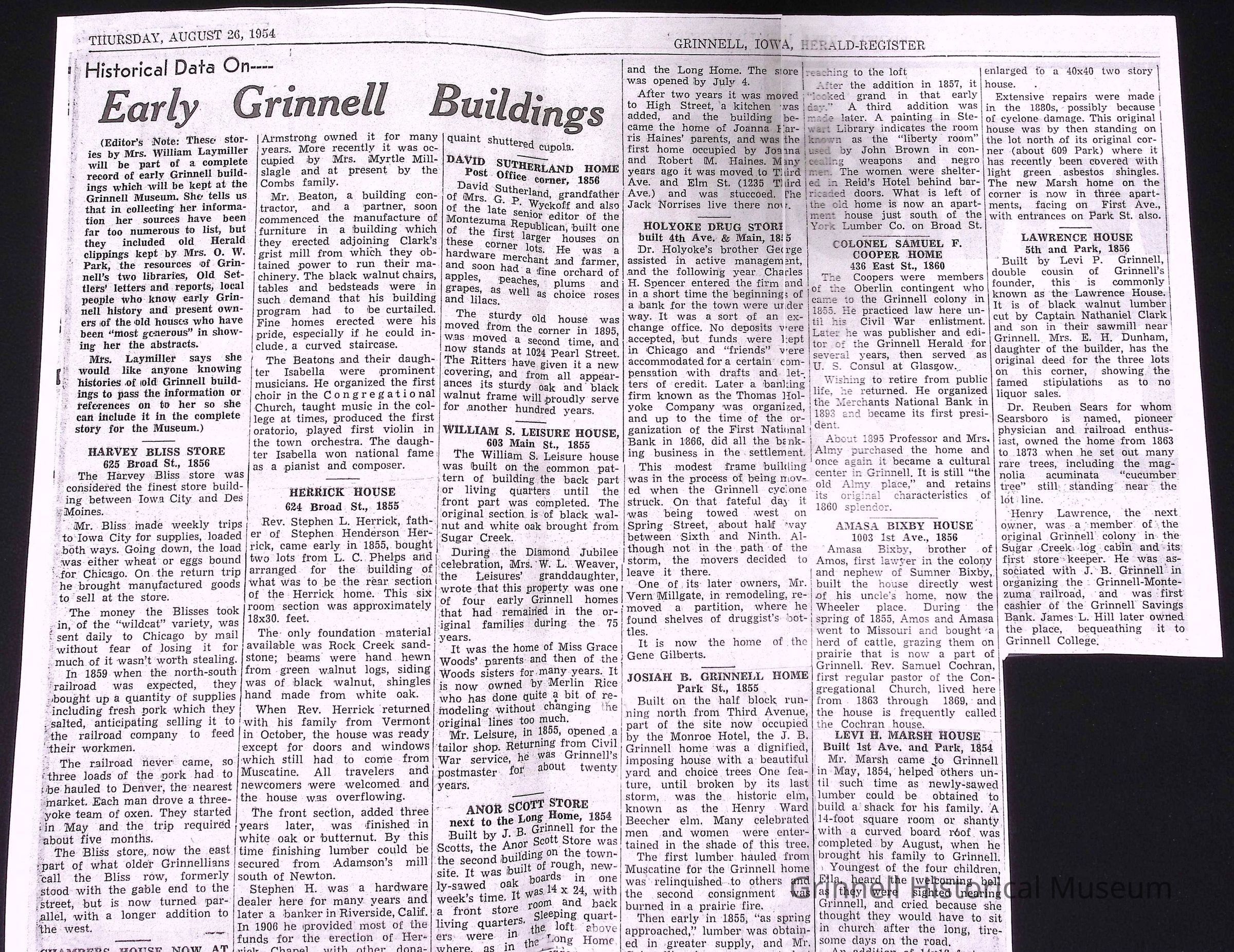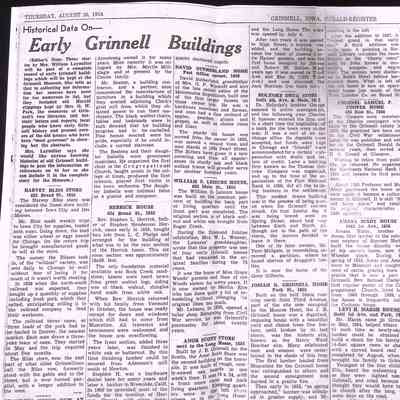 The collection contains the Laymiller inventory of Grinnell houses; documentation from historic homes tours; articles on demolition of houses and house moving; downtown building facades; and articles on particular houses.
