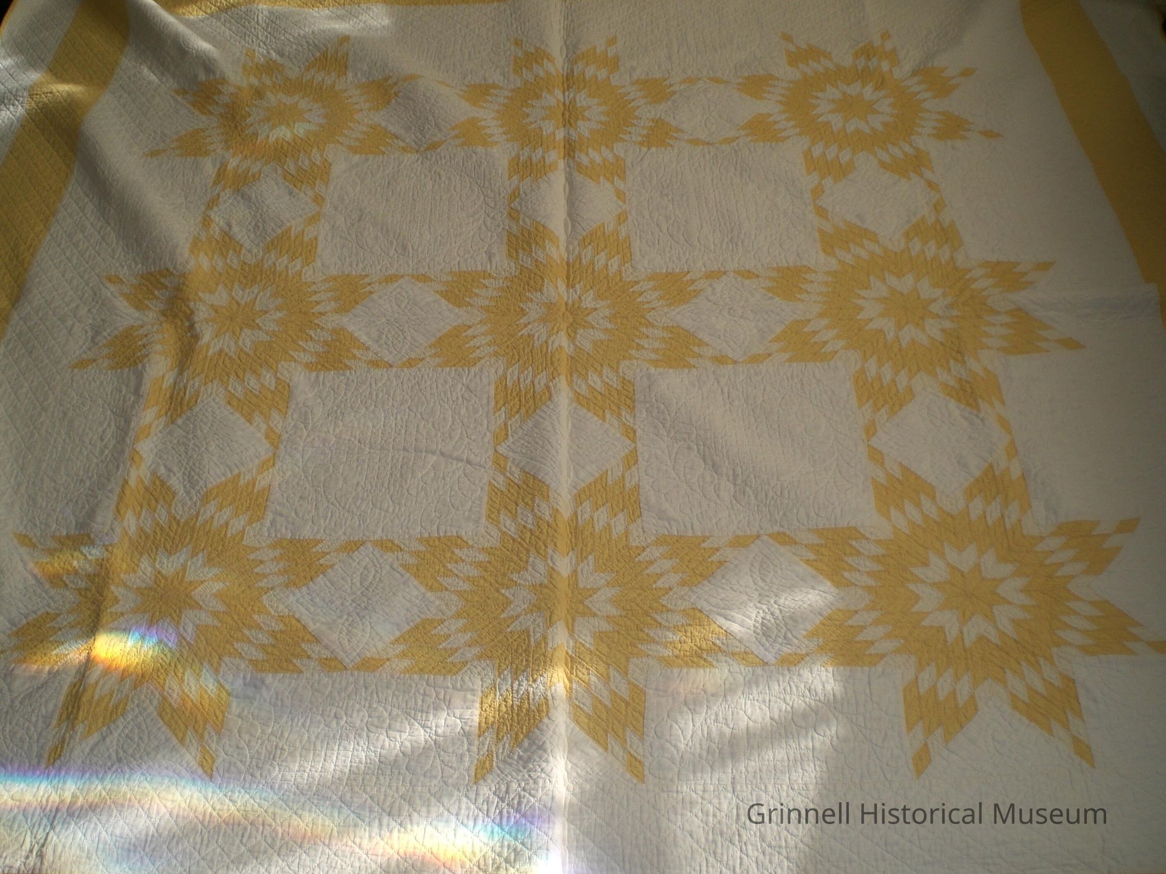Bed-sized quilt, yellow and white. Hand-pieced Star of Bethlehem pattern, hand-quilted. The quilts were passed down to donor by her mother (S. Louise Bell of Marshalltown, Iowa). The quilts were made by donor's great-aunt Calista Hufford who was always known as "Lista". Lista was born in 1862 and died in 1943 at the age of 81.Provenance