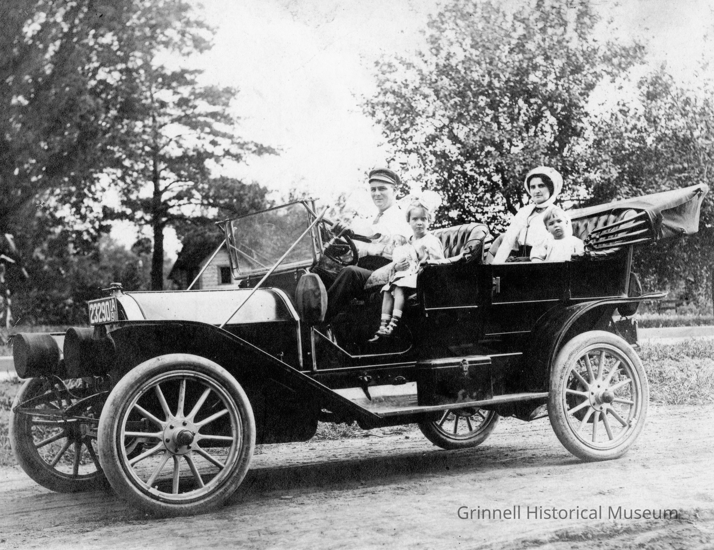 Photograph of a Spaulding automobile, a Rittenburg 40 HP 4-cylinder model, built first in Grinnell, Iowa. The Dr. A.J. Brock family is pictured. In the front seat are Dr. Brock and Beatrice (age 3 1/2), and in the back seat are Edith Brock and Atwood W. Brock (age 1 1/2). The car cost the original owner $4800.