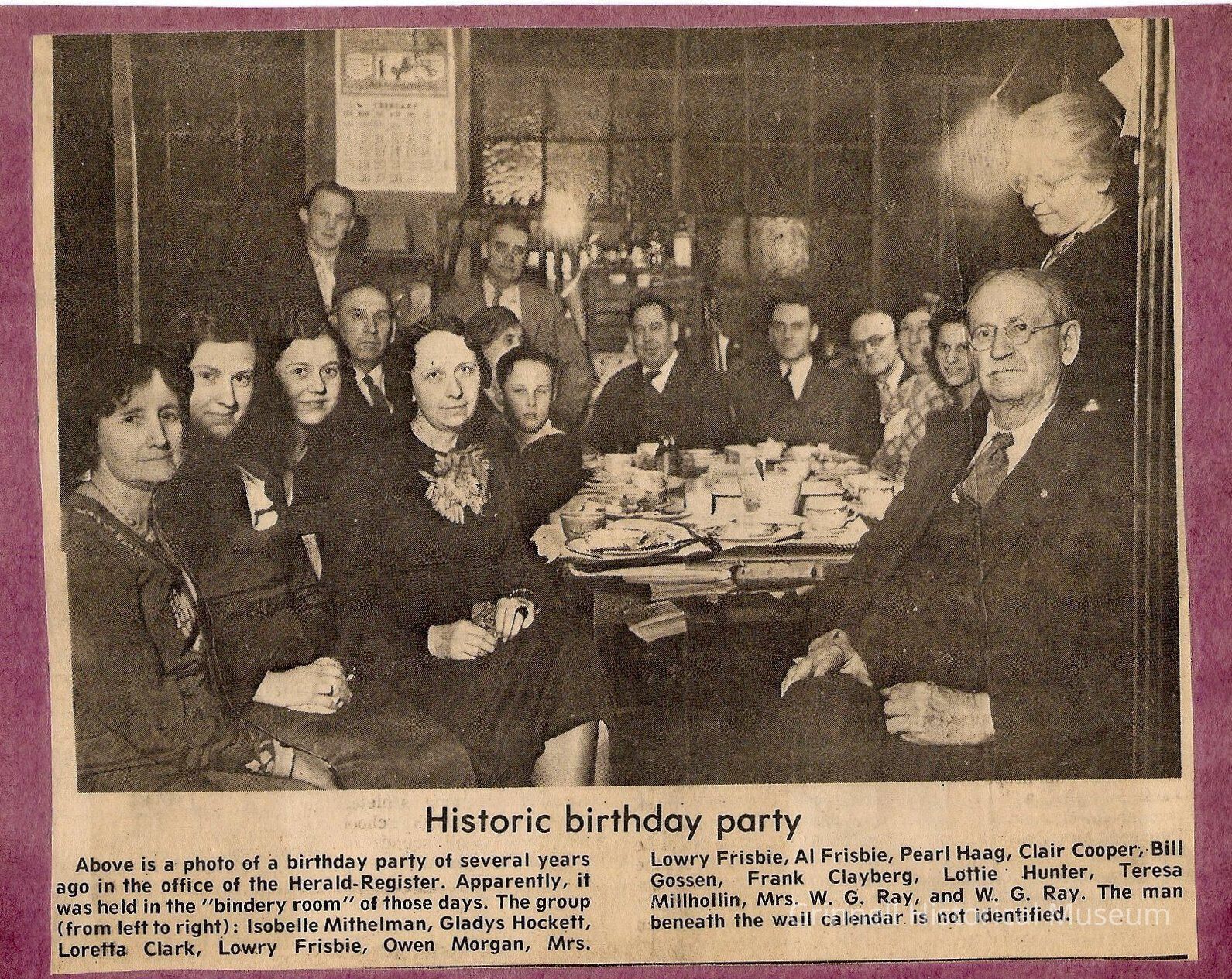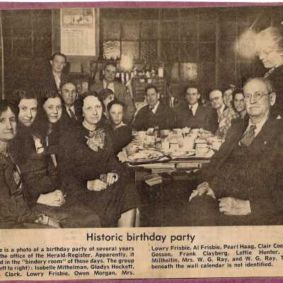 Newspaper clipping from Herald-Register of birthday party held at Herald-Register office.