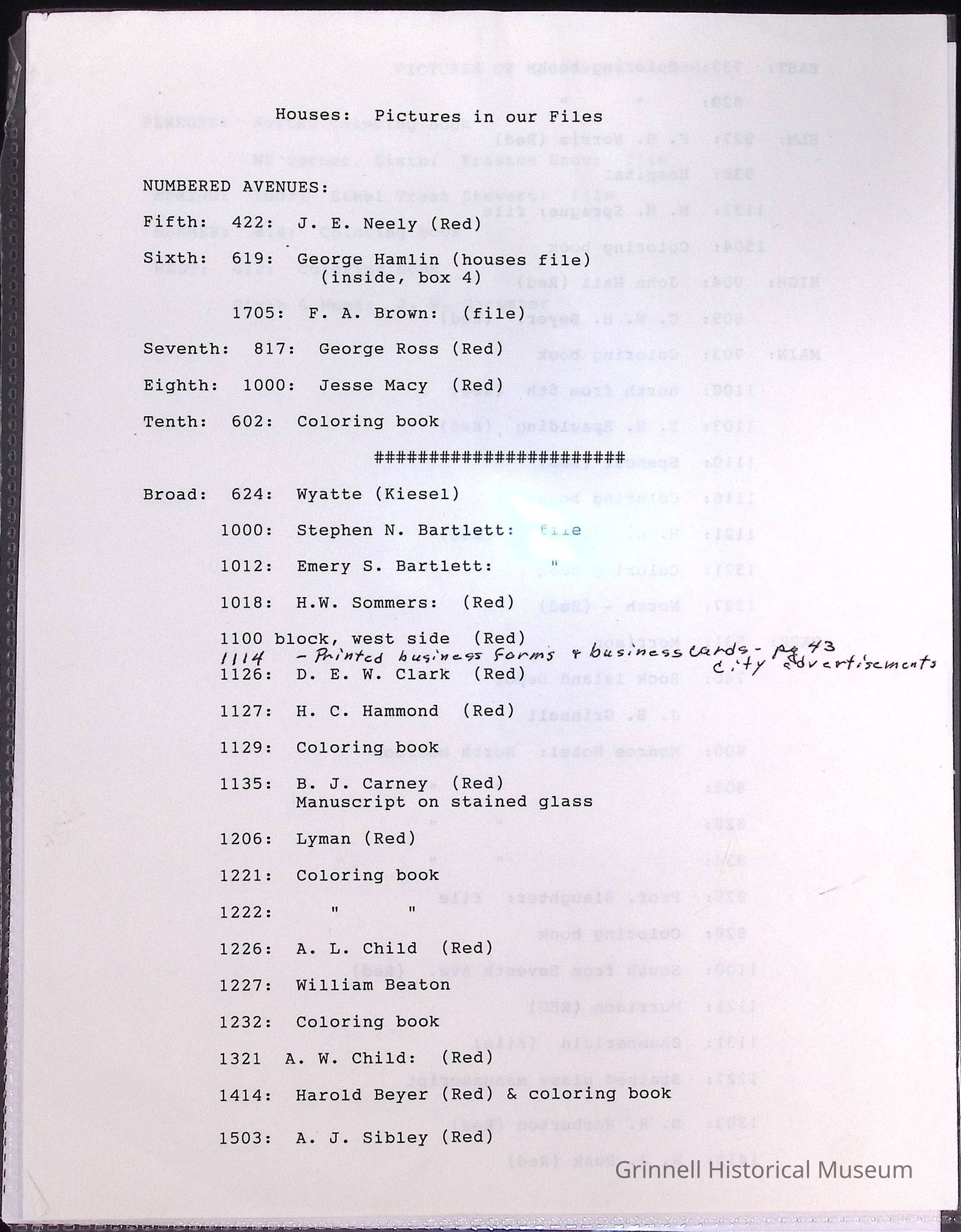 The collection contains the Laymiller inventory of Grinnell houses; documentation from historic homes tours; articles on demolition of houses and house moving; downtown building facades; and articles on particular houses.