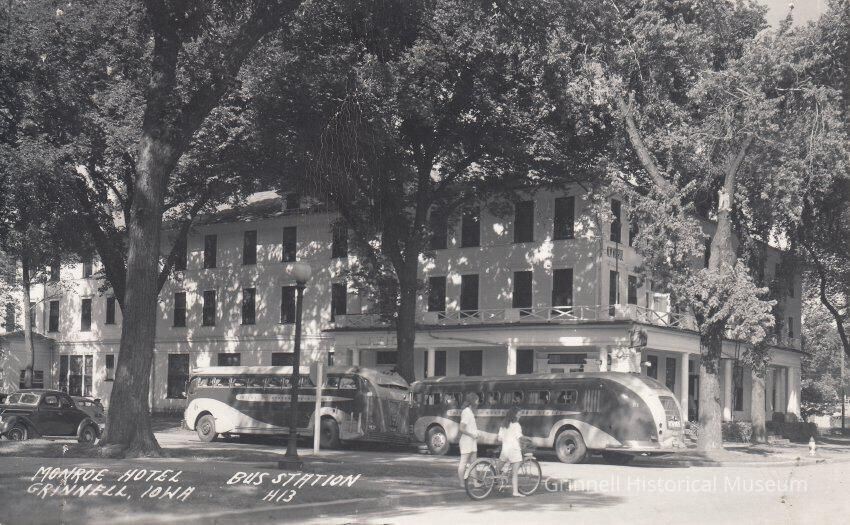 Postcard showing a side view of the Monroe Hotel and Bus Station H13 in Grinnell, Iowa with tall trees around it. An automobile and two small buses are parked on the side of the hotel. In the foreground, two young girls are standing with a bicycle and some boxes and looking across the street toward the hotel. The postcard is from Velma Hiser, the wife of George Hiser, who ran the hotel from 1933 to 1960.