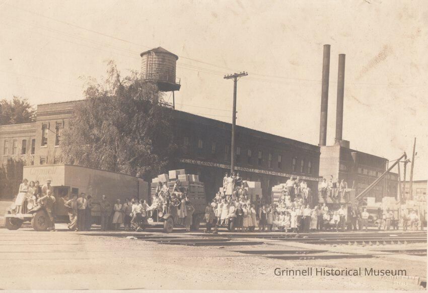 Photo of Morrison Manufacturing Company (today the Old Glove Factory) in Grinnell with a line of vehicles piled with boxes and workers on 3rd Avenue near the railroad tracks. A large truck is in front, followed by smaller vehicles all loaded with goods for shipment. Workers, mostly women, are standing on the vehicles for the photo. In the background, the old water tower rises from behind the factory.