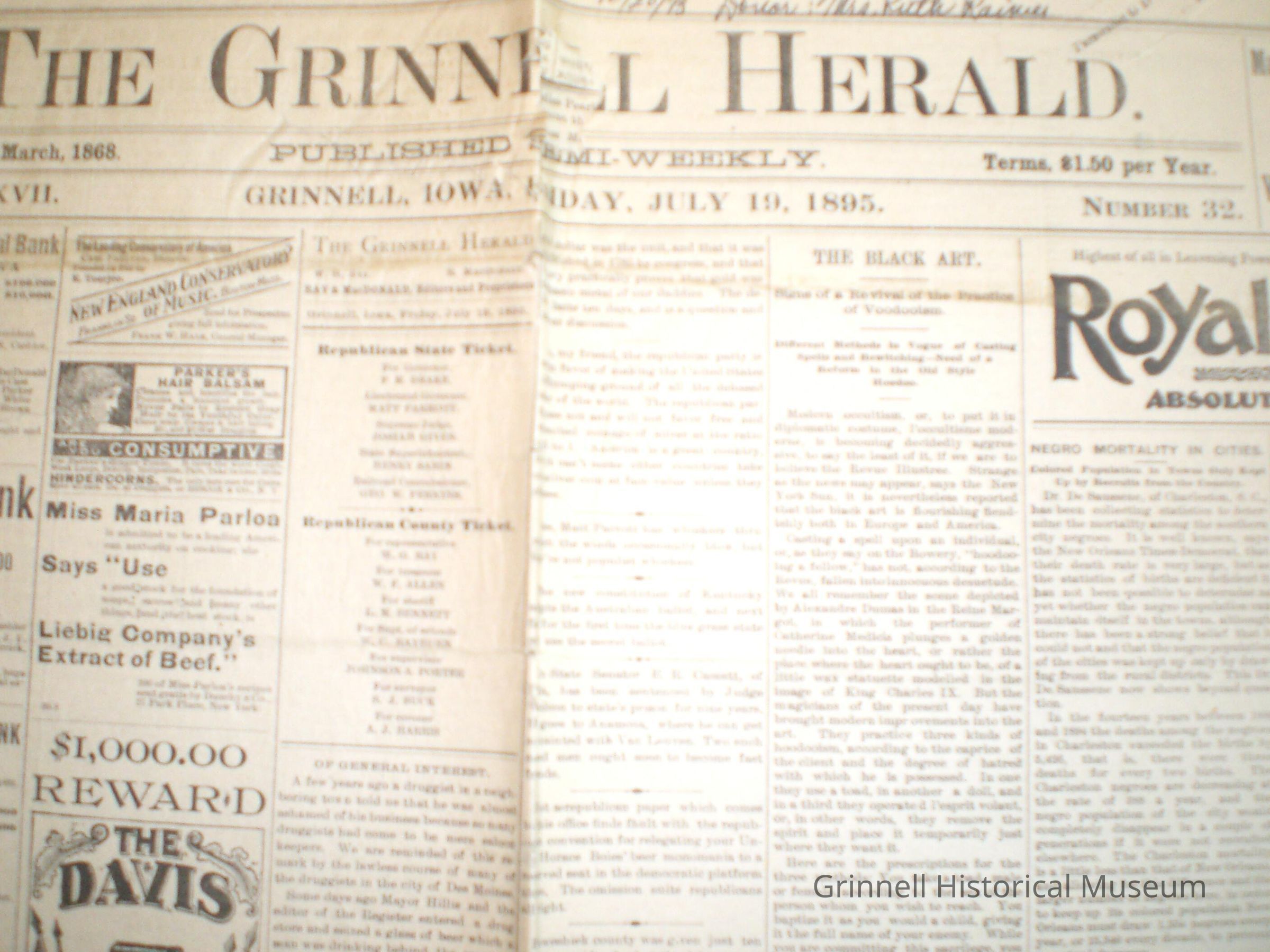 The Grinnell Herald of 7/19/1895, featured ad for J. H. McMurray, Jr., Dry Goods, Carpets and Millinery. McMurray was the owner of the building how housing the Grinnell Historical Museum.